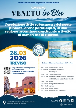 Il Veneto si tinge di blu. Sabato 28 marzo 2026, a Treviso, il Comitato Regionale F.I.P.S.A.S. Veneto promuove “VENETO in Blu”, una giornata interamente dedicata all’evoluzione delle attività subacquee e del nuoto pinnato – con uno sguardo particolare alle discipline paralimpiche – che stanno facendo del nostro territorio un punto di riferimento a livello nazionale.